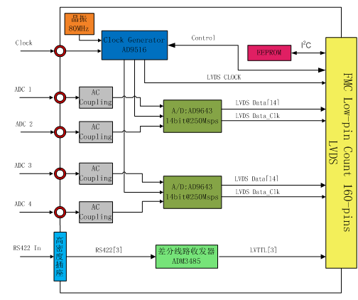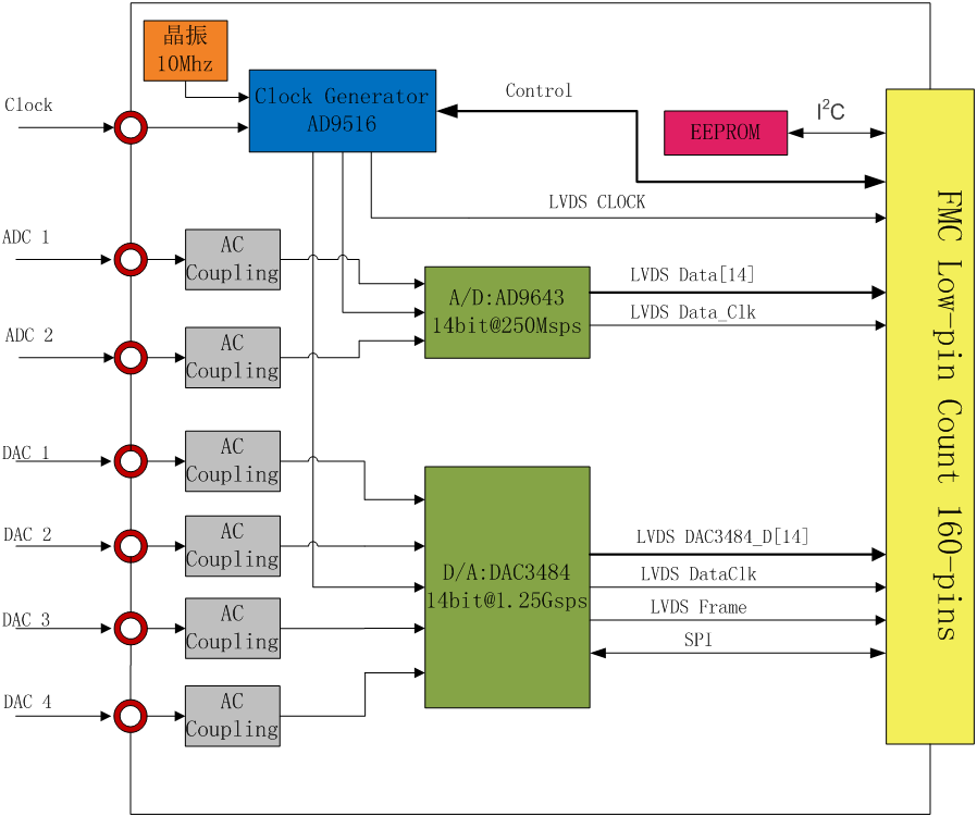 - A/D和D/A芯片的工作时钟由时钟输出发生器AD9516提供,AD9516的参考时钟可以通过同轴电缆连接外部提供,或由片上晶振提供。